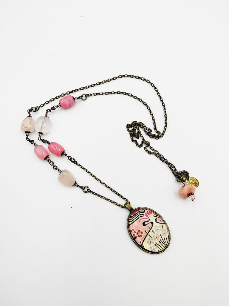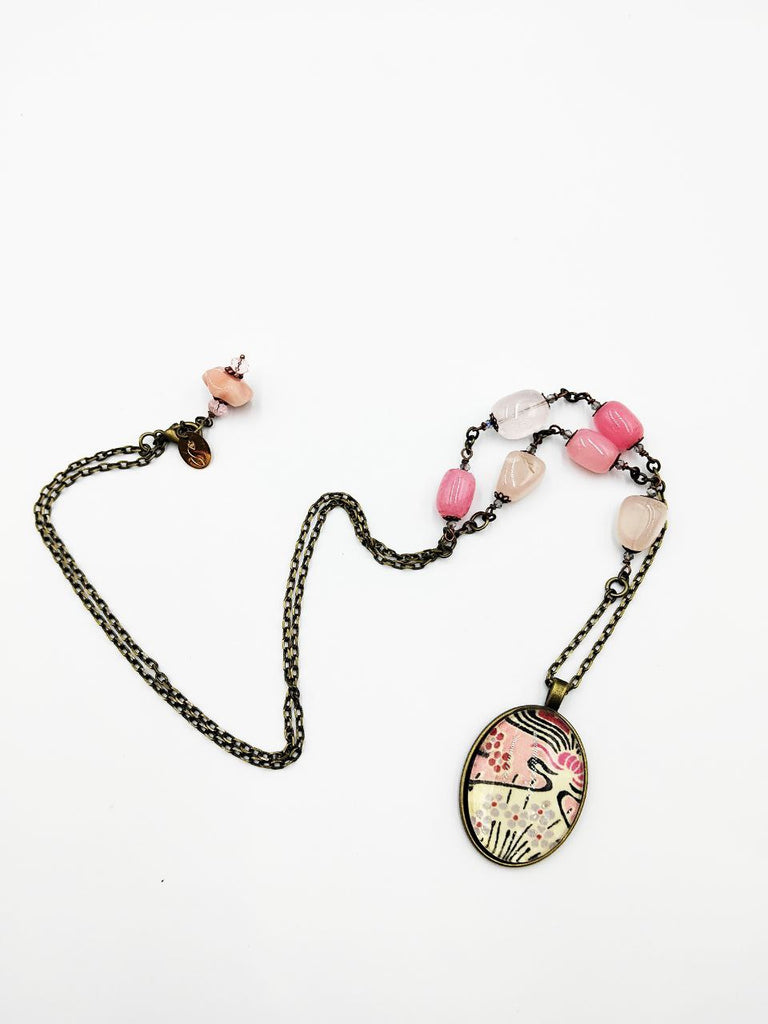 Medaglione Liberty Rosa con Quarzi Rosa e Rodocrositi. Il Quarzo Rosa è da sempre la pietra associata all'amore ed è reputata capace di attirare l'amore verso chi la indossa. Viene inoltre ritenuta una pietra che infonde calma, aiutando a superare le sfide nella vita e a vivere con leggerezza.