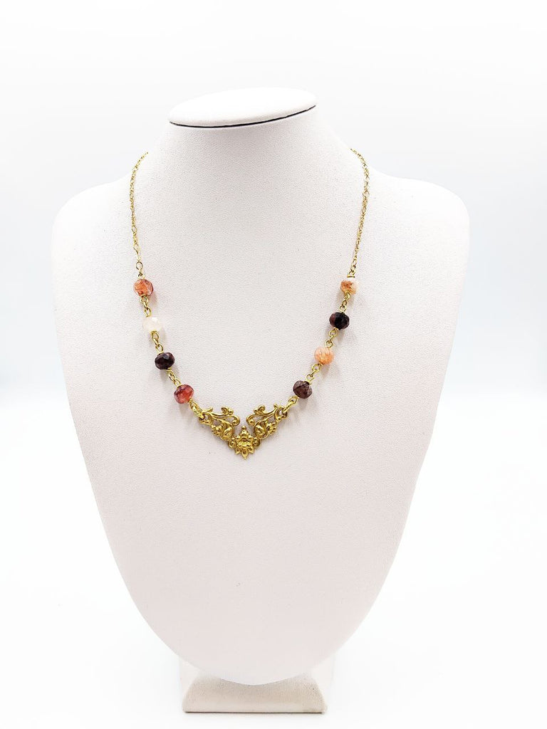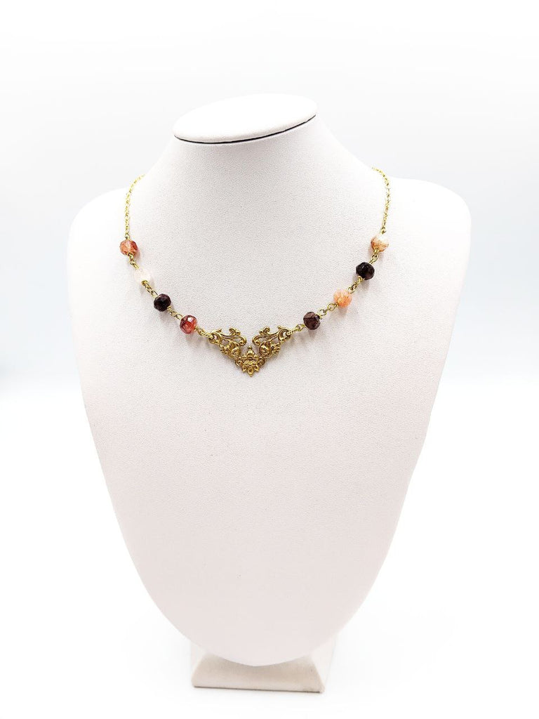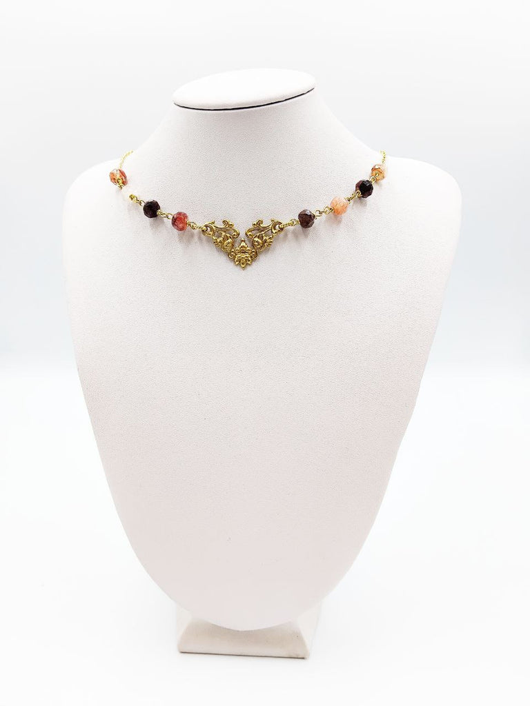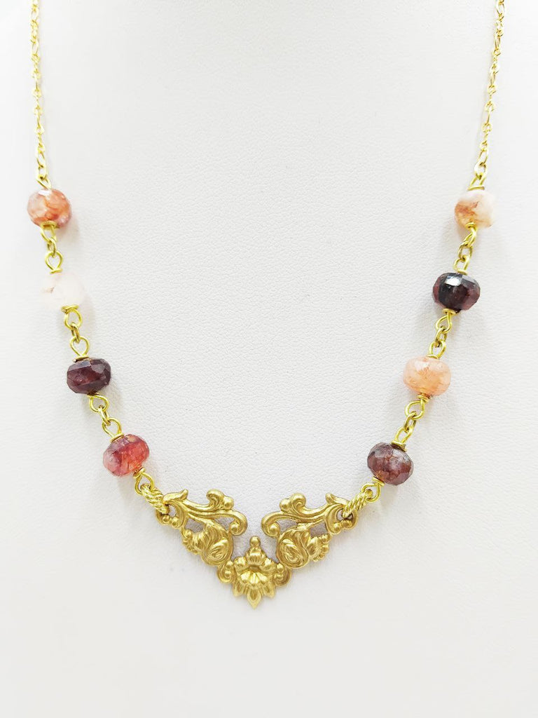 Una collana in galvanica oro con decoro Liberty e Quarzi Rosa Misti a rondelle. Perfetta per una donna elegante, affascinante e consapevole del proprio valore.