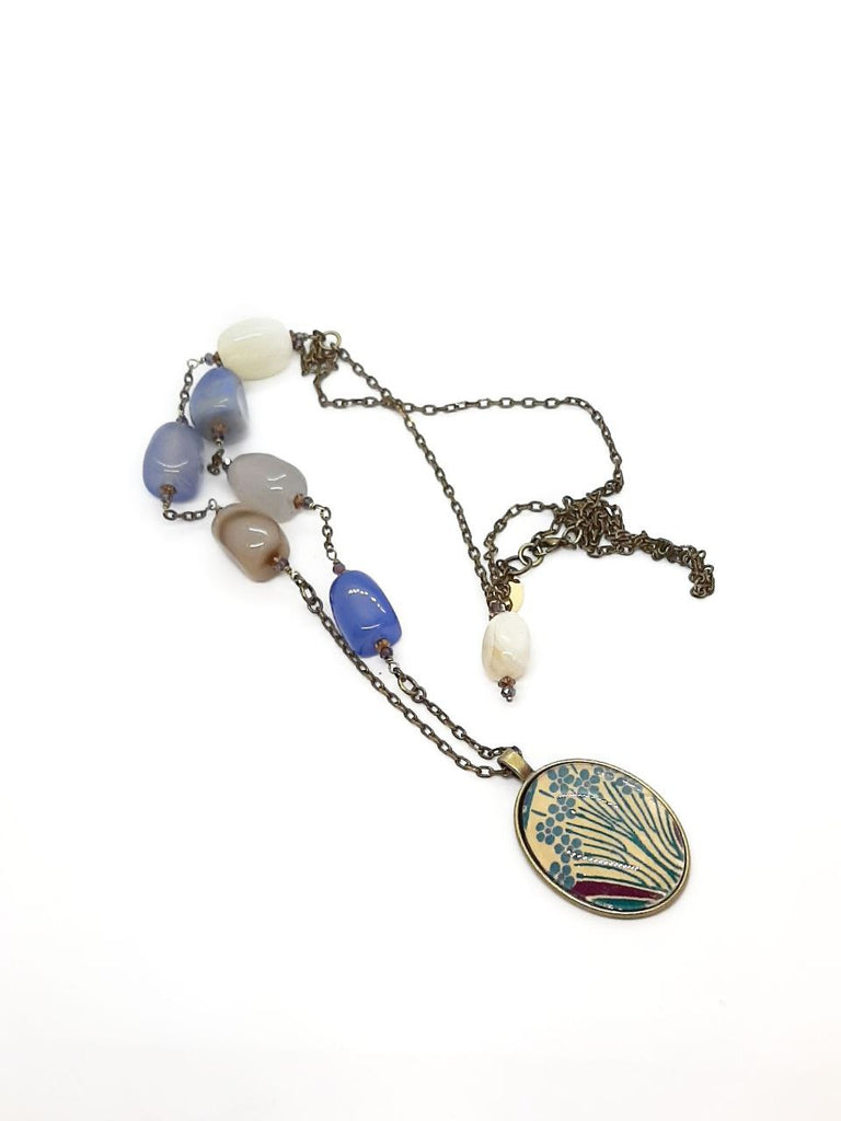 Un Medaglione Liberty Pervinca/Crema con Agate Pervinca, Pietre di Luna e Cristalli Viola. Perfetto per una donna elegante, affascinante e consapevole del proprio valore.