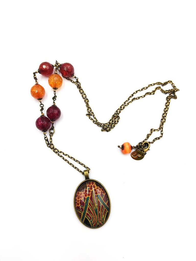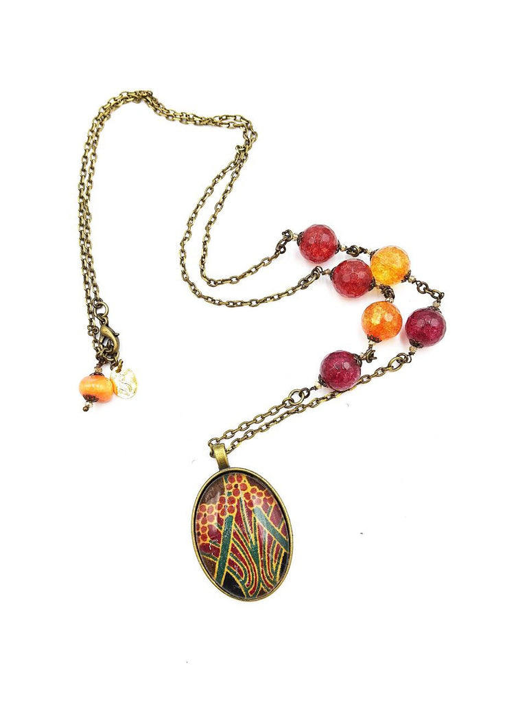 Un Medaglione Liberty con Agate Bordeaux e Arancio Miste, Cristalli luminosi. Perfetto per una donna elegante, affascinante e consapevole del proprio valore.