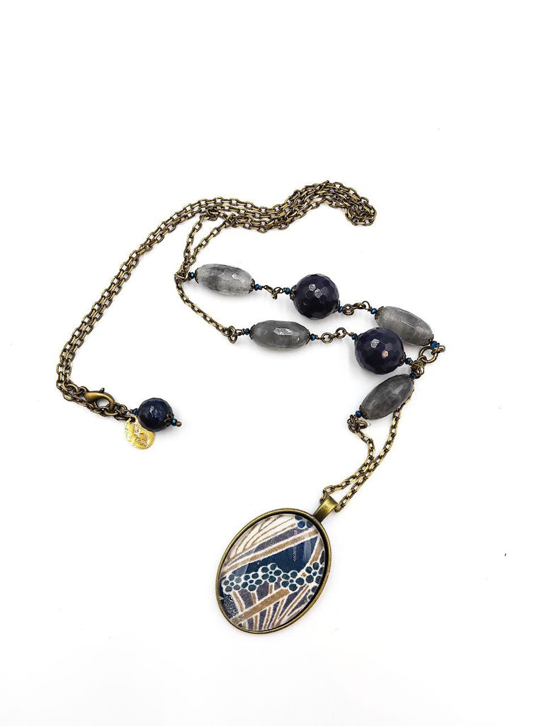 Un Medaglione Liberty con Agate Blu e Quarzi Grigi Misti, Cristalli luminosi. Perfetto per una donna elegante, affascinante e consapevole del proprio valore.