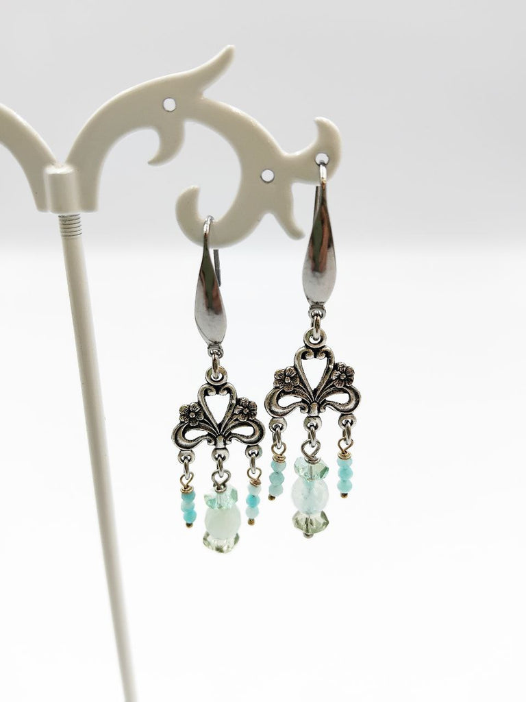 Un paio di Orecchini decoro Liberty con Amazzoniti e Quarzi Azzurro/Verdi in galvanica argento. Perfetti per una donna forte, decisa, autonoma e consapevole del proprio valore.