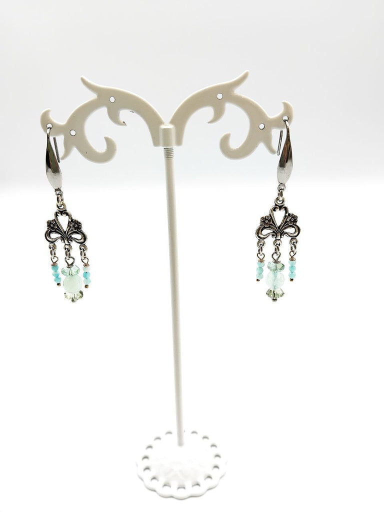Orecchini decoro Liberty con Amazzoniti e Quarzi Azzurro/Verdi in galvanica argento. L'Amazzonite infonde risolutezza, fiducia e senso di libertà. È una pietra di trasformazione. Rafforza la capacità di prendere decisioni e sviluppa l'intuito personale.
